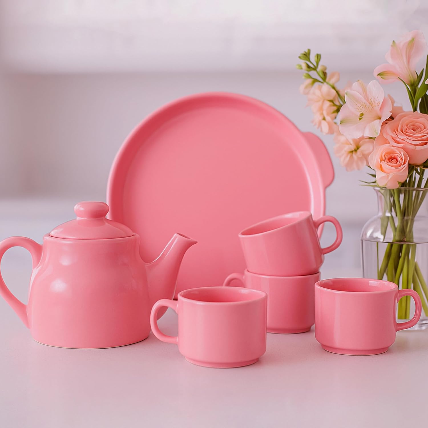 Included Components: 4 Tea Cups, 1 Kettle and 1 Serving Tray | Colour : Pastel Pink | Capacity of Tea Cups: 150 ml, Capacity Of Kettle: 700ml; Ideal for Serving Tea and other hot beverages